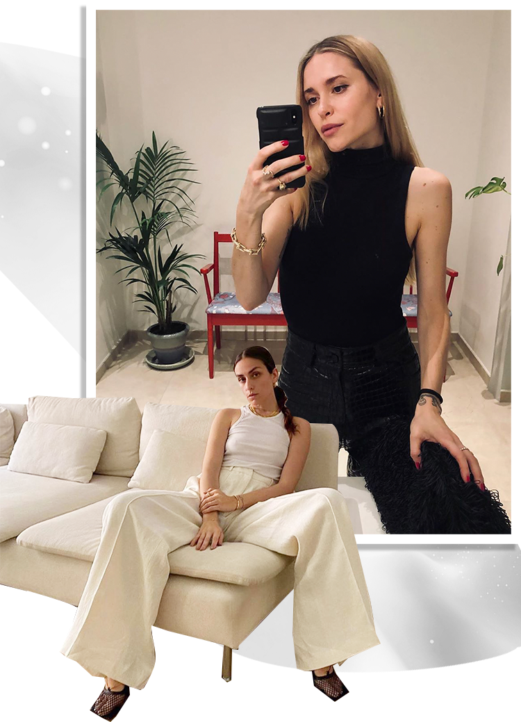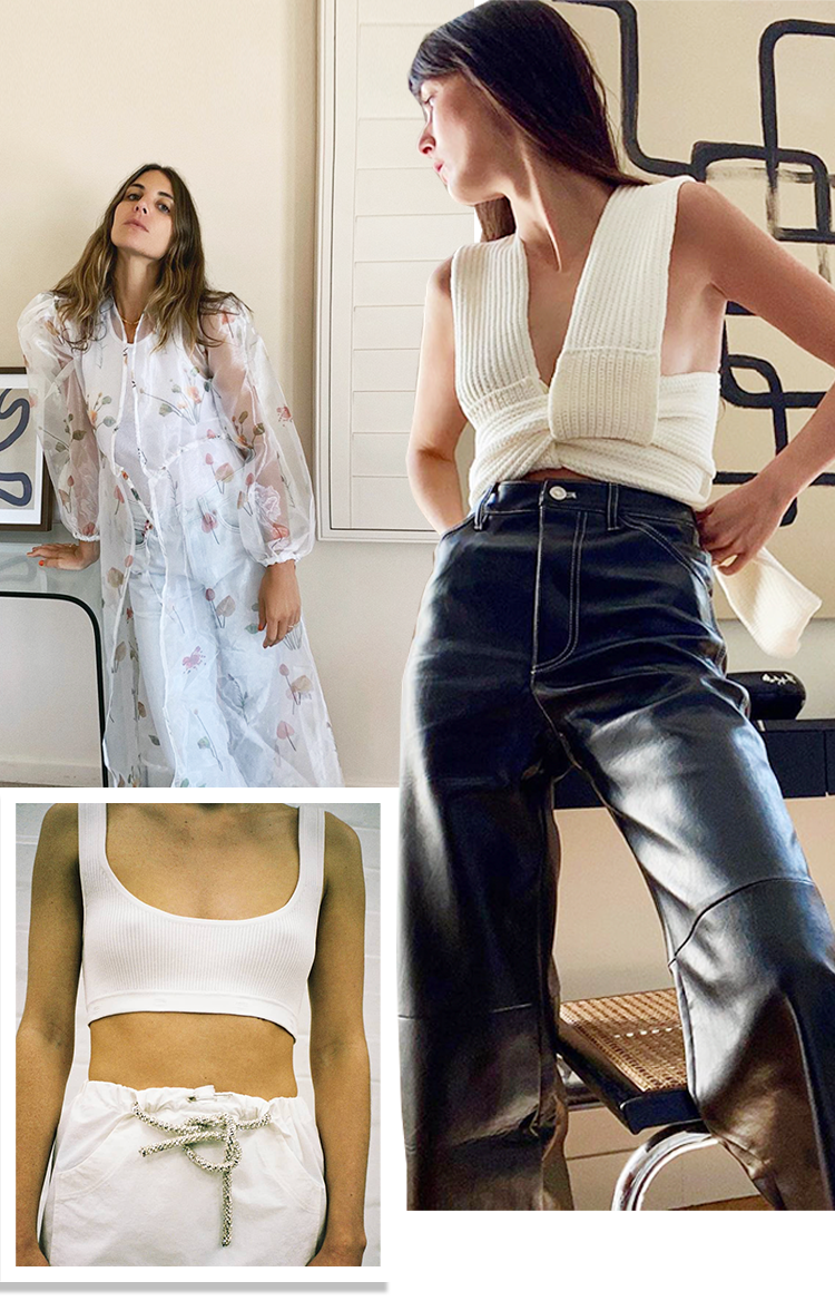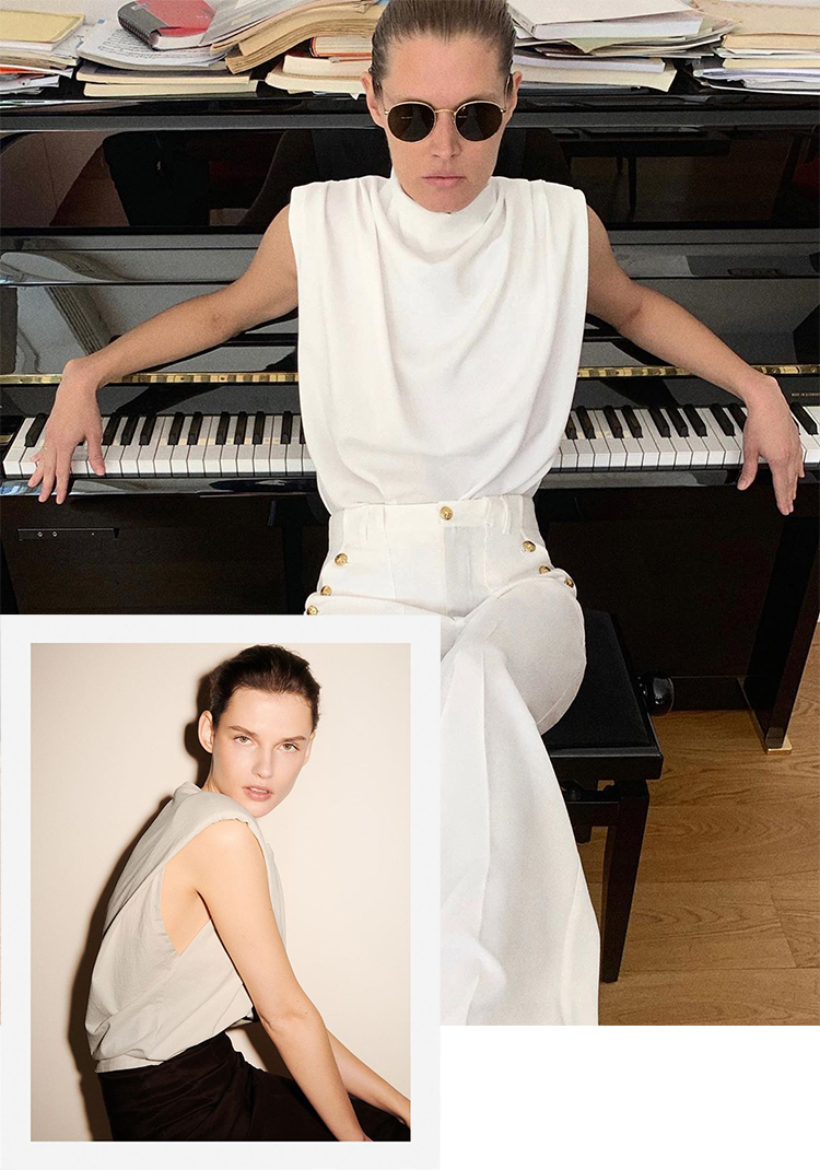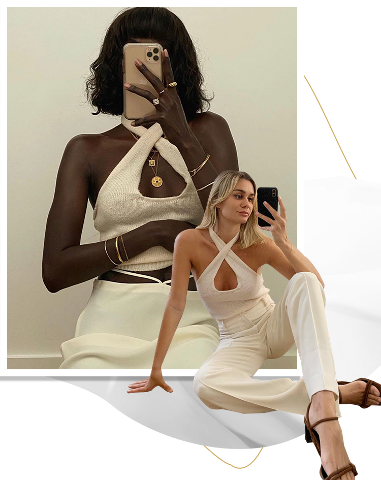 法国博主Adenorah这两件局部不规则挖洞款更别致,分别来自Zalando、Zimmermann,同样搭配了相似阔型的长裤,在极简与复古之间自由切换。