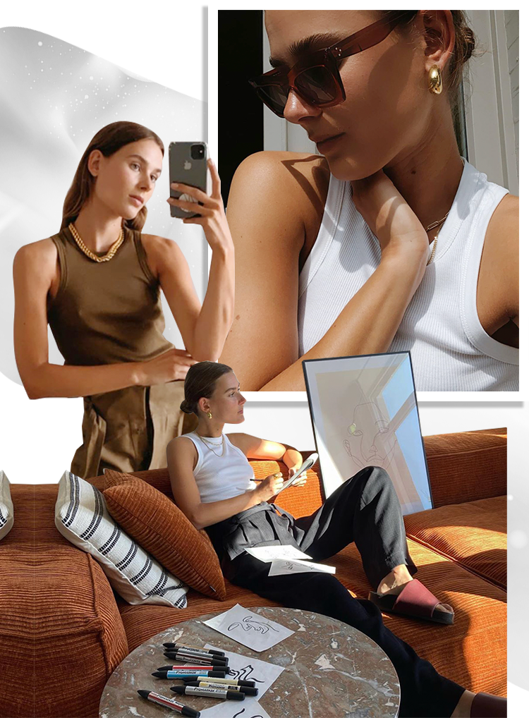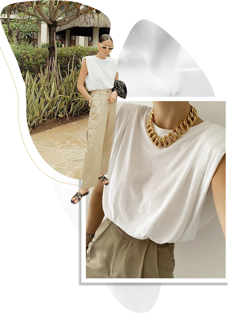 因为款式简单,露肤度也高,背心look尤其适合搭有分量感的配饰,这两年购入的链条项链用来叠戴就很不错。