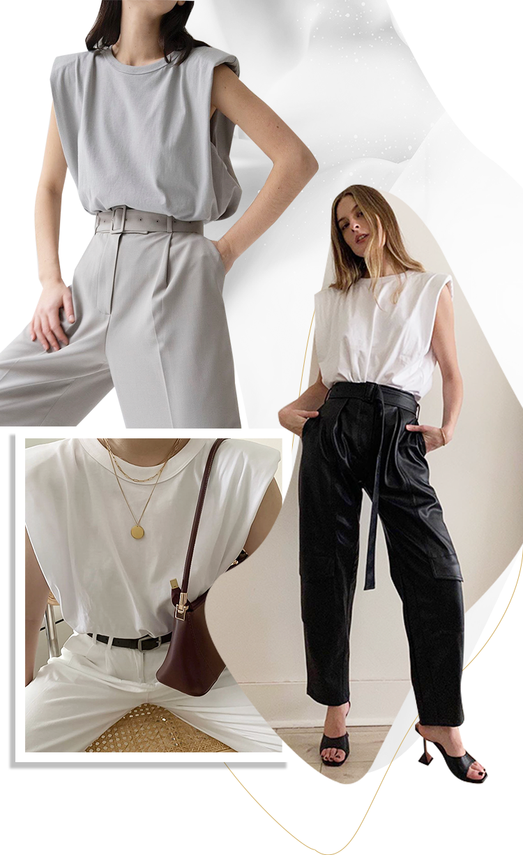 一种是这两年很火的“老爹款”背心,领口和肩部挖空的设计,最大程度露出显瘦的直角肩、锁骨部位。