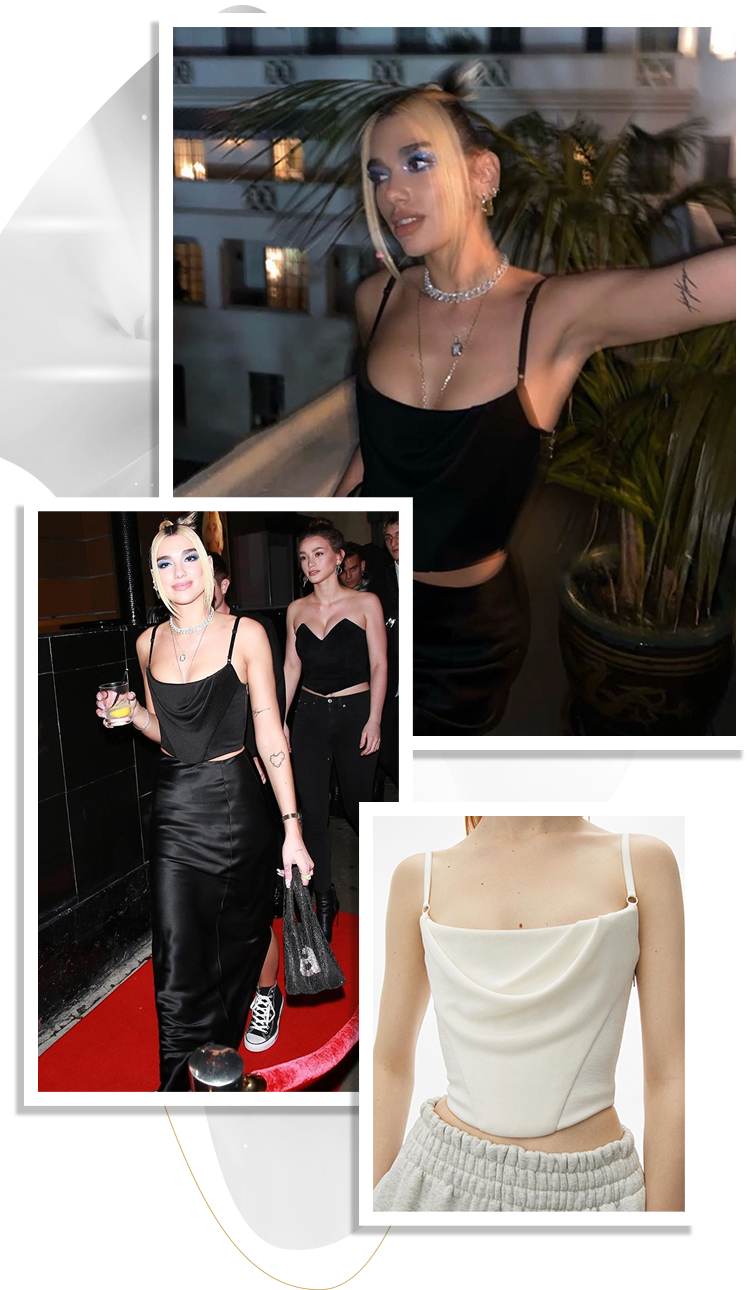 比较特别的设计,像Dua Lipa这种胸衣款,能有效支持腹部,凸显细腰。她穿的好几件都是来自Alexander Wang的,价格约3千左右。