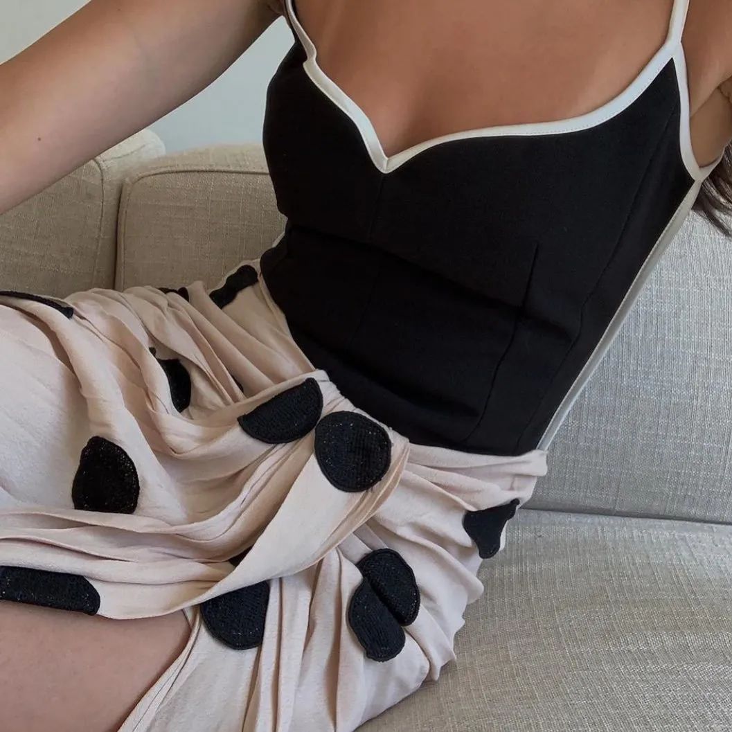 这种款式虽然露的肉不少,但不会过于性感。法国博主Camille Charriere这件来自品牌Christopher Esber。