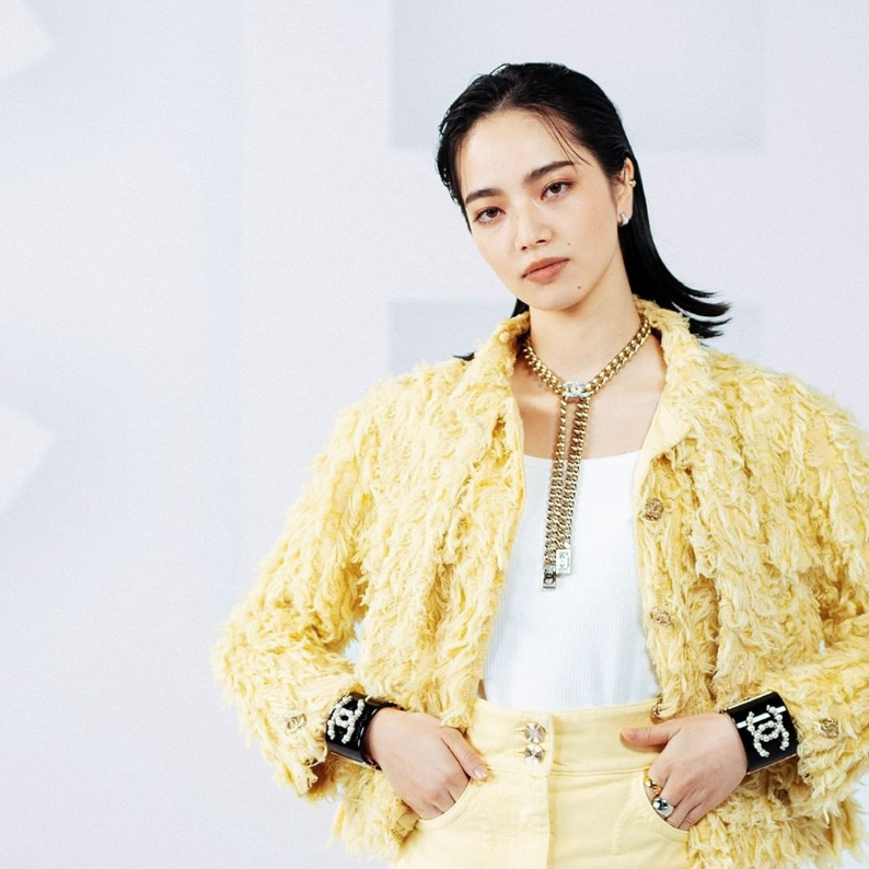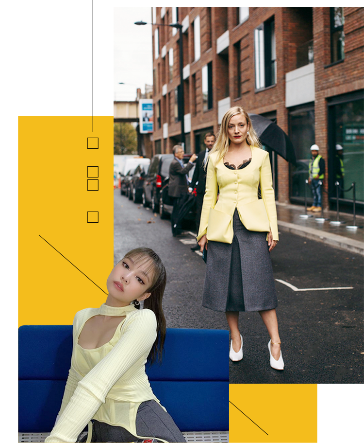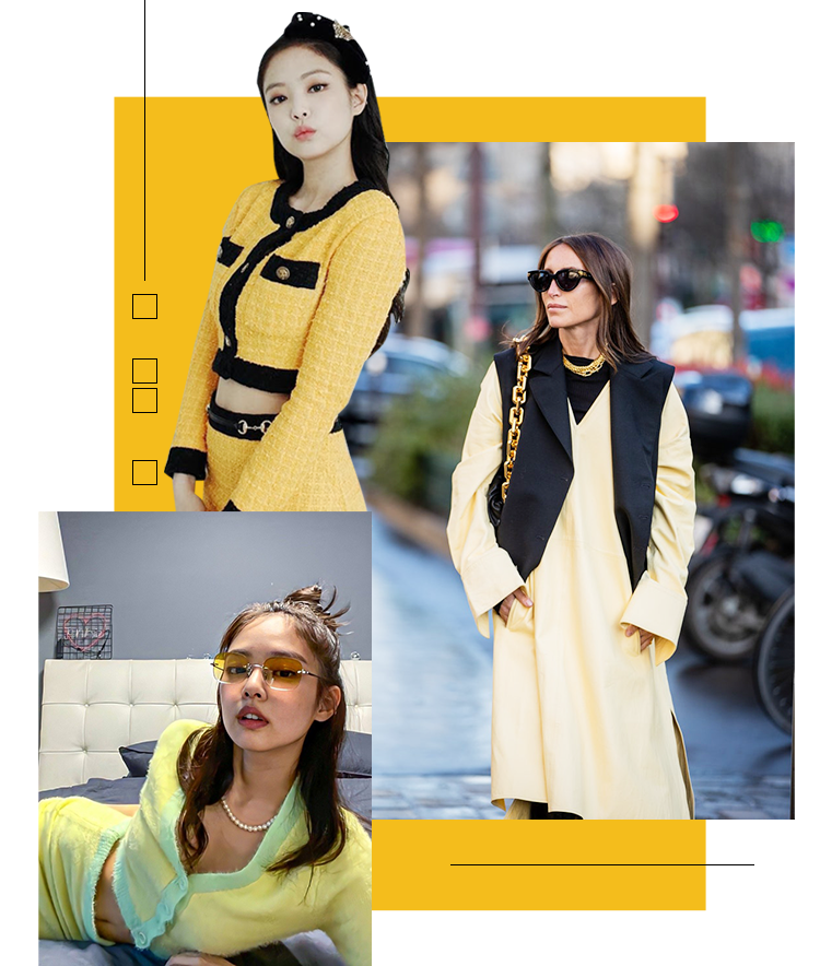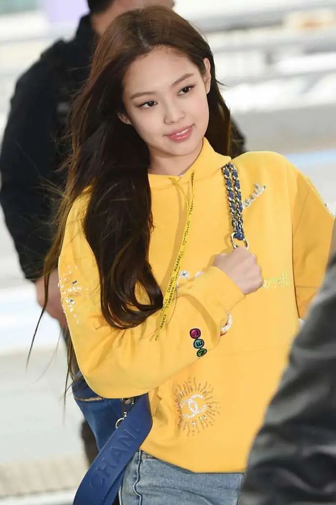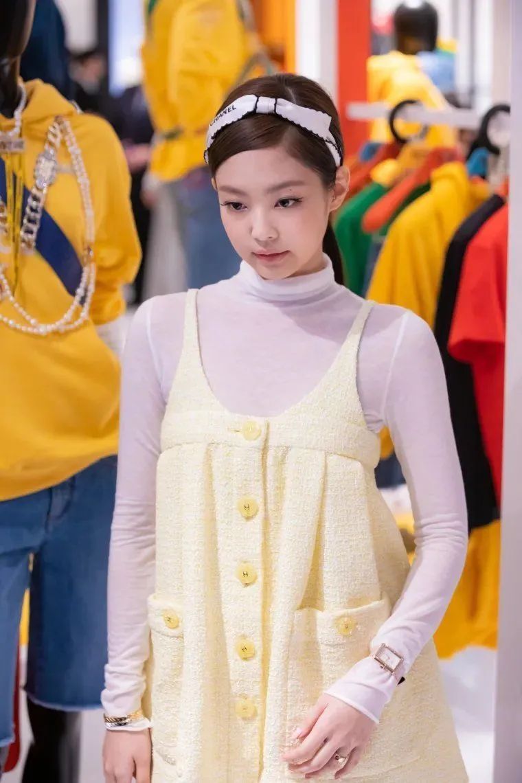 深黄色很容易压肤色,可以像Jennie这样选择饱和度较低的黄色,更容易好看。