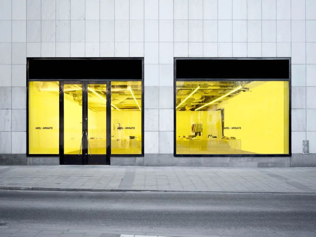 Axel Arigato用黄色玻璃镶嵌在灰色门头,让整个屋子充满了温暖的氛围,同时又非常简洁。