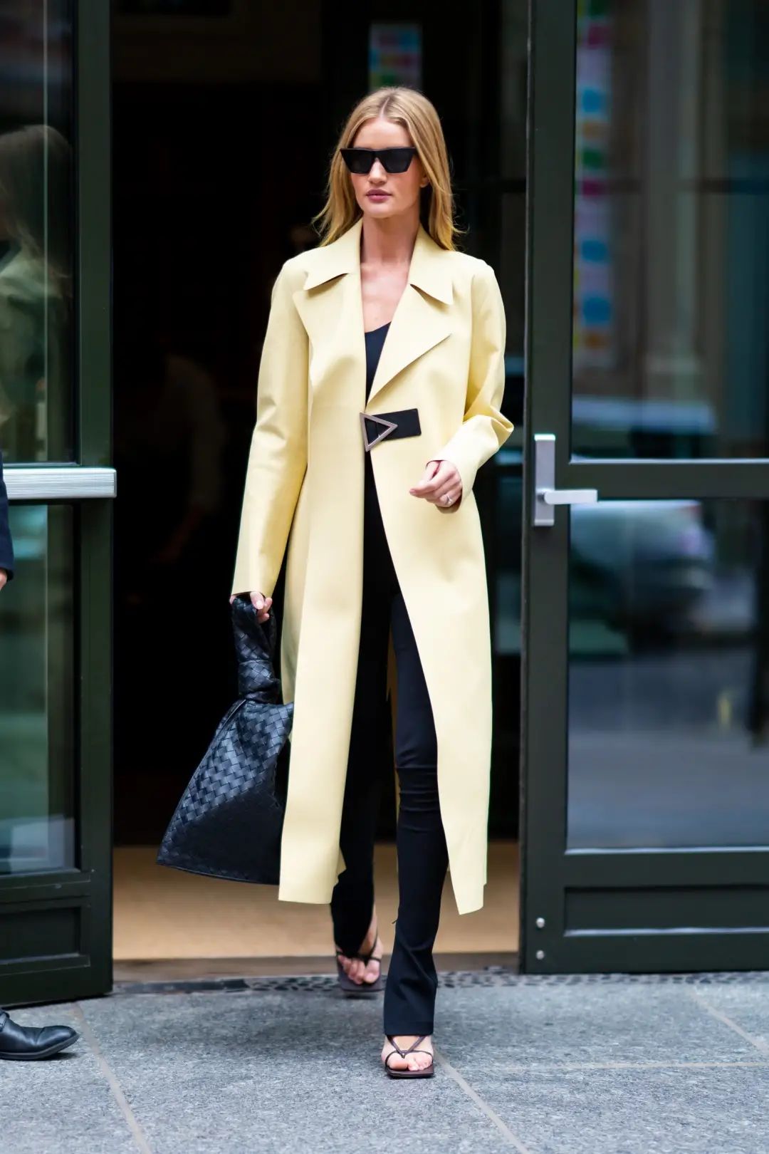 Bottega Veneta这件黄色大衣很多明星都穿过,霸道总裁和少女都可以驾驭,就算是气场十足的Rosie,也选择了用黑色打底来增加层次感。