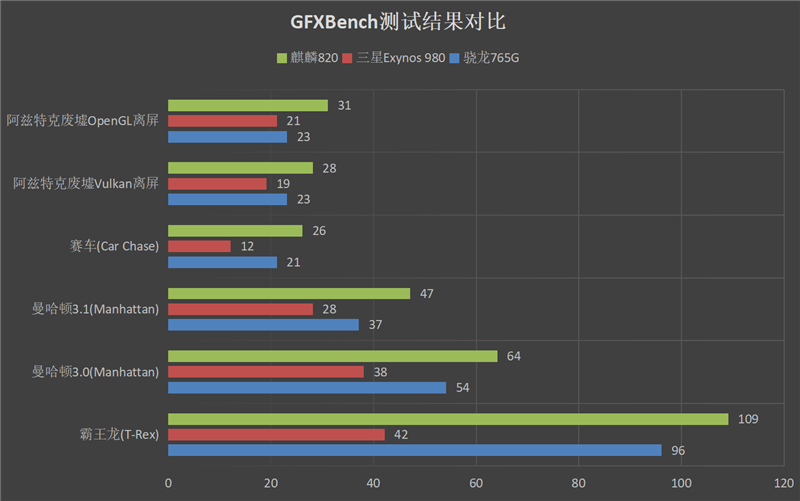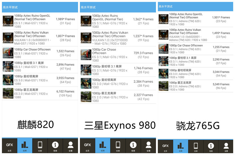 GPU方面不仅没有束缚,通过我们对于麒麟820进行的GFXBench测试,发现它的表现较大幅度超过了同属次旗舰的Exynos 980,甚至还在每一个测试项目当中超过了图形表现长期占据优势的骁龙765G,这样的突破不可谓不大。
