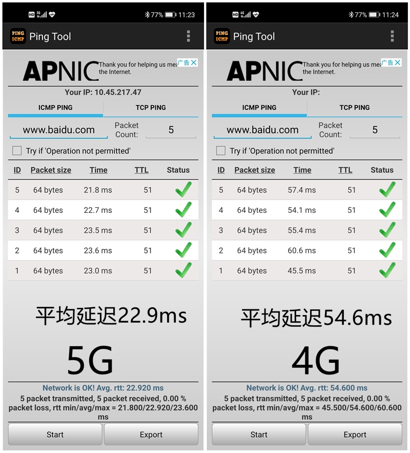 以上分别是ping baidu 5G(左)、4G(右)网络的延迟表现。可以看到在测试环境下,4G网络平均延迟为54ms,5G网络下平均延迟为22.9ms。在麒麟820支持下的荣耀30S手机,5G网络延迟比4G网络环境下低了大约31.7ms。