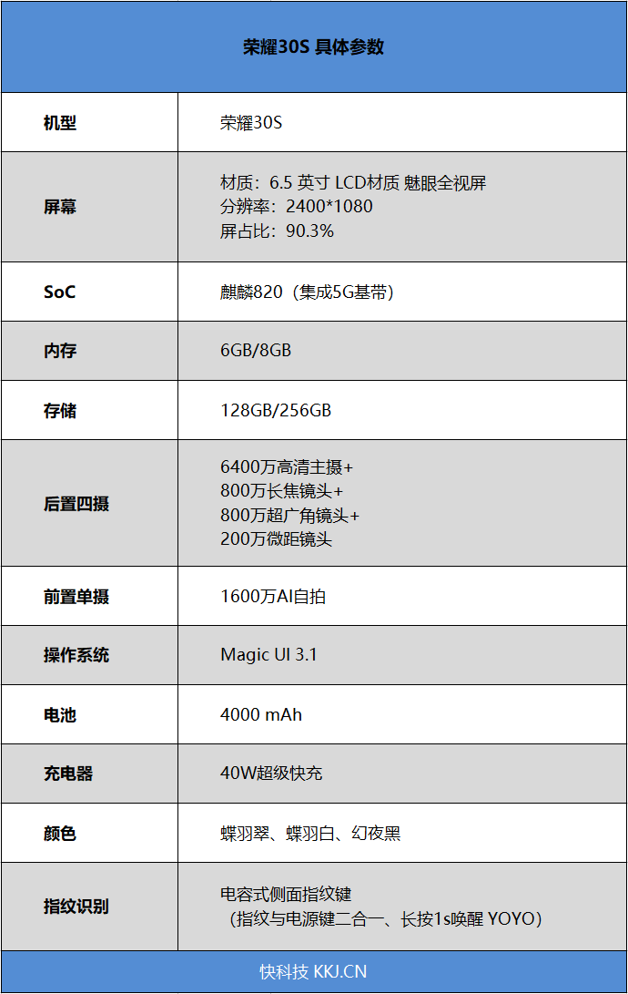 当然,在开始评测之前,还是先来看一眼荣耀30S的参数规格。