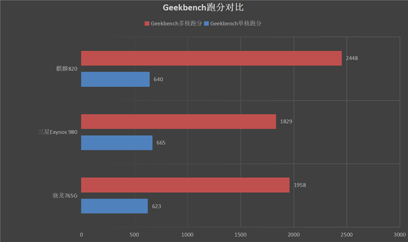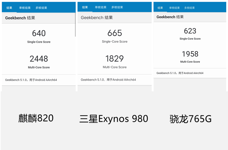 也就是说,根据Geekbench 5的评价体系,在体现绝对性能的单核心方面,麒麟820、骁龙765G、Exynos 980算是棋逢对手,难以拉开差距。但是到了考验调度配合的多核心测试,麒麟820的表现要远远好于另外两位。
