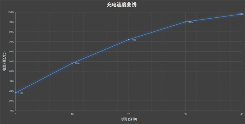 得到旗舰同级下放的荣耀30S支持最高40W超级快充方案,通过实测,我们发现最快40分钟即可让这4000毫安时大电池从18%充到98%,速度相当给力。