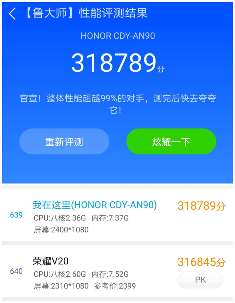 在上市前软件未对手机做任何适配优化的前提下,打开性能模式的荣耀30S鲁大师跑分成绩超过了31万分,在鲁大师的评分体系当中已经小胜搭载麒麟980 SoC的荣耀V20,可见麒麟820此番为之赋予的性能实力。