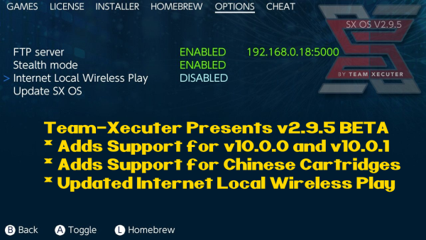 本周,TX团队(Team-Xecuter)发布了SX OS自制系统的最新版本,v2.9.5 Beta,该版本支持了任天堂最新的V10.0.0和v10.0.1固件,同时改善了兼容性,优化了本地联机的稳定度。
