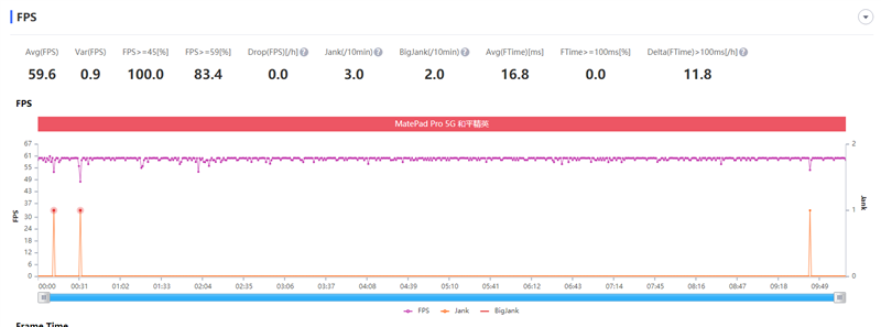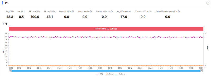在最高画质下,华为MatePad Pro 5G运行《王者荣耀》的帧率非常稳定,60FPS封顶,平均帧率达到了58.8FPS,整个游戏中的帧率曲线非常平稳。
