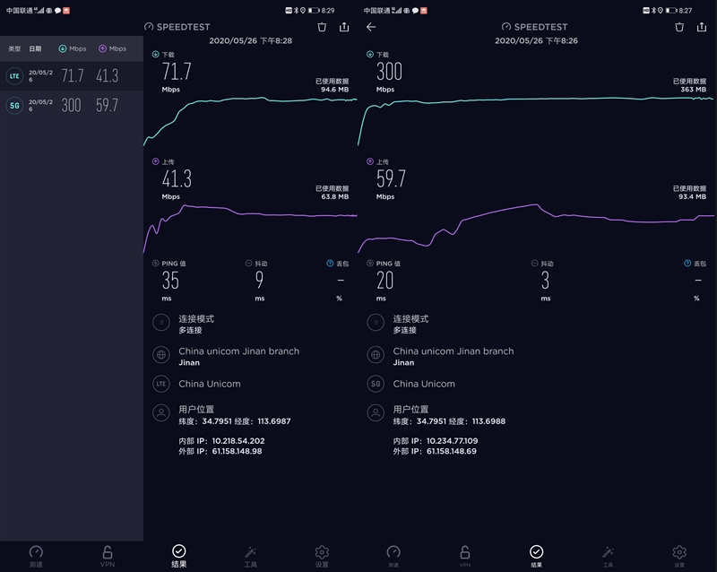 通过一个简单的测试即可看到两种网络下的差距。在5G网络下,无论是平均延迟还是网络抖动都要远小于4G网络中的数值。5G网络下平均延迟仅20ms,抖动也维持在3ms以内,意味着像视频通话、电话会议都能更加的稳定,并且能够大大避免因为延迟而导致的声画不同步的情况发生。利用无线网络提供堪比有线的稳定、低延、高速率,就是5G最大的价值。