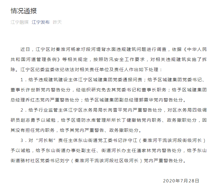 近日,江宁区对秦淮河杨家圩段河堤背水面违规建筑问题进行调查,依据《中华人民共和国河道管理条例》等相关规定,按照防汛安全工作要求,对相关违规建筑实施了拆除。江宁区纪委监委依纪依法对相关责任单位及责任人作出如下处理:
