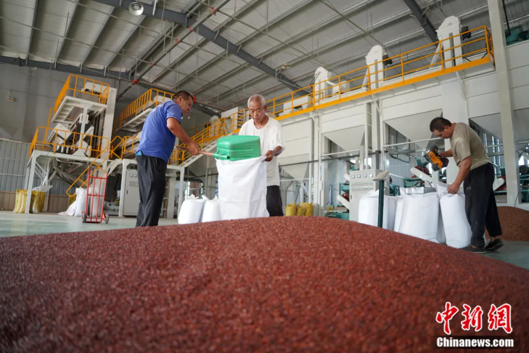 2025年9月8日,在河北省邢台市内丘县北赛酸枣种植基地,村民将酸枣仁装袋。刘继东 摄