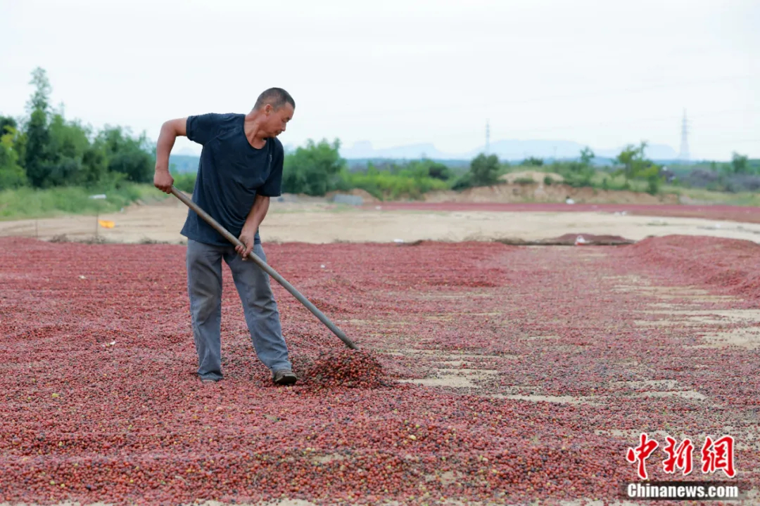 2025年9月4日,在河北省邢台市内丘县樊交台酸枣种植基地,村民在翻晒酸枣。刘继东 摄