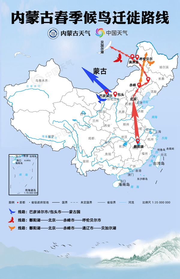 中国有句俗语:不打三春鸟,不吃四月鱼。阳春三月天渐暖,各种动物禽类渐入繁衍后代佳期,因此,劝君莫打三春鸟,子在巢中待母归。劝君莫吃四月鱼,万千鱼仔在腹中。况且动物、禽类是人类的好朋友,地球是我们共同的家园,人类有责任爱护和保护它们,当我们与这些鸟儿有缘相遇时,能很好的欣赏和保护鸟儿们,做个有慈悲之心的人。愿北归候鸟,一路平安!(策划/郭敏 制作/田艳芳 监制/陈悦 审核/金柏青 数据支持/内蒙古气候中心 张宇)