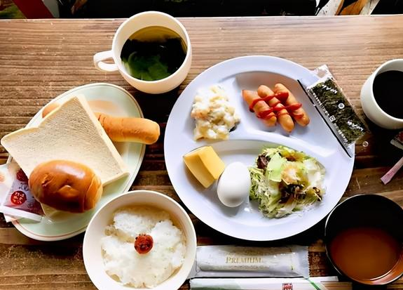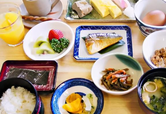 一般一碗米饭、一份味噌汤、一撮纳豆以及些许水果也就差不多了。纳豆在日本家庭的早餐里面也很常见,虽然闻起来很可怕,但是其营养价值却很高。有时候一碗纳豆拌饭就够撑过一个上午,有些能够提供朝食的饮食店只在早上能够吃到纳豆,便利店里的纳豆饭团也是随处可见。