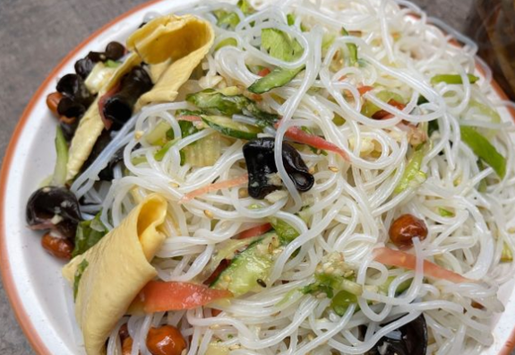 阿姨店铺里的白味三丝是一道纯素菜,听这个名字大家可能以为里面只有三种食材,其实这道菜是以海带丝、笋子、粉丝为主,除此之外还加了胡萝卜丝、黄瓜丝、青菜等等。味道偏淡没有放辣椒,花椒也很少,蒜香味和香油味很突出,所以这道菜适合口味比较清淡的人,重口味的客人就会觉得偏淡了。这道菜15块钱一份,分量很大,性价比还是挺高的。