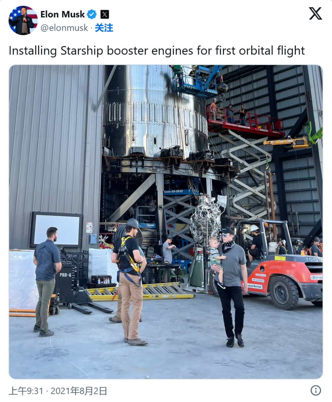 马斯克配文:为第一次轨道飞行安装星舰助推器引擎