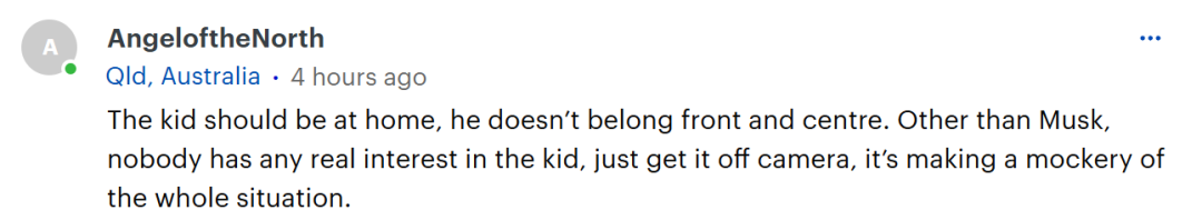 这孩子应该待在家里,他不该出现在前面和正中间的位置。除了马斯克之外,没人真正对这孩子感兴趣,把他从镜头前弄走就行,他这样让整个局面都成了笑柄。