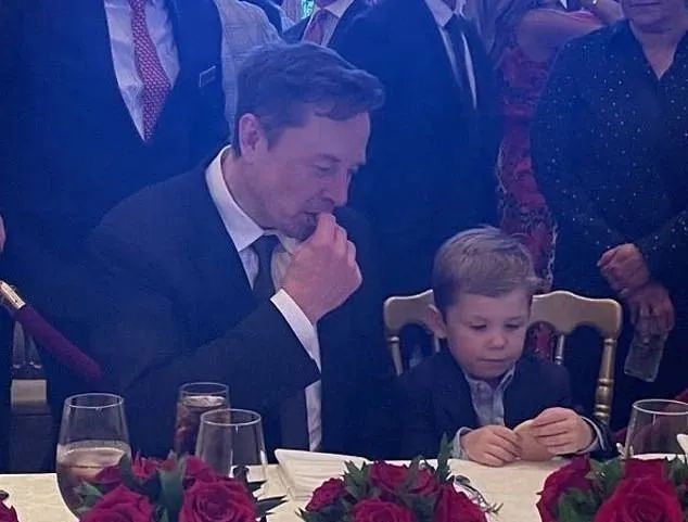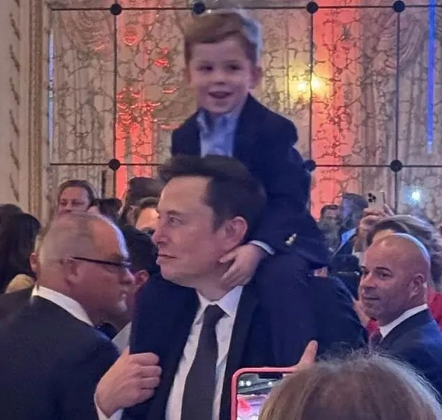去年10月,参加特朗普的选举前派对时,马斯克带上了小X↓