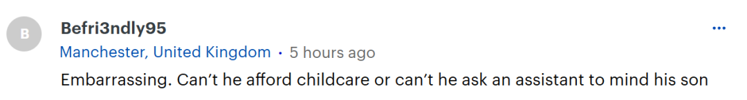 真丢人。难道他请不起人照看孩子吗,还是说他连让助手帮忙照看一下儿子都做不到?