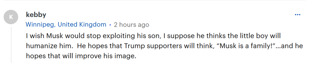 希望马斯克能停止利用他的儿子,我猜他觉得这个小男孩能让他显得更有人情味。他指望支持者们会想:“马斯克也是个重视家庭的人!”而且他希望这样能改善自己的形象。