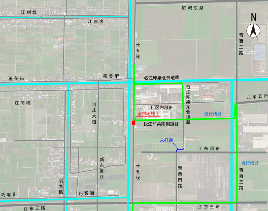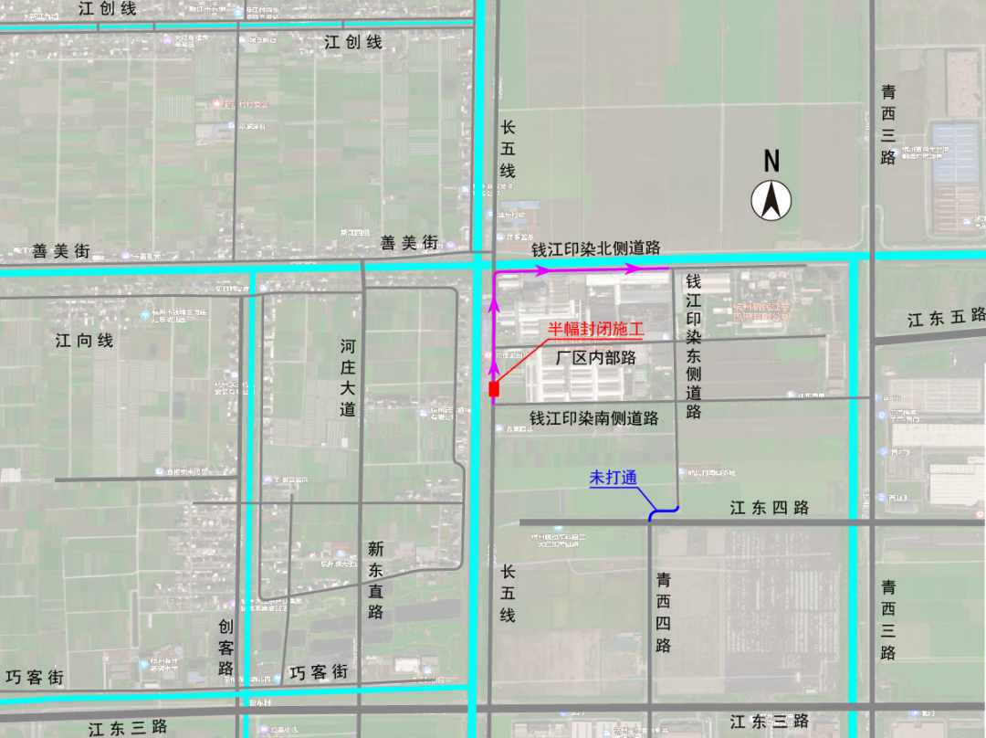 2023年5月25日至2023年6月9日期间,义蓬街道长五线(钱江印染南侧道路—钱江印染北侧道路)、钱江印染北侧道路实施半幅封闭施工。