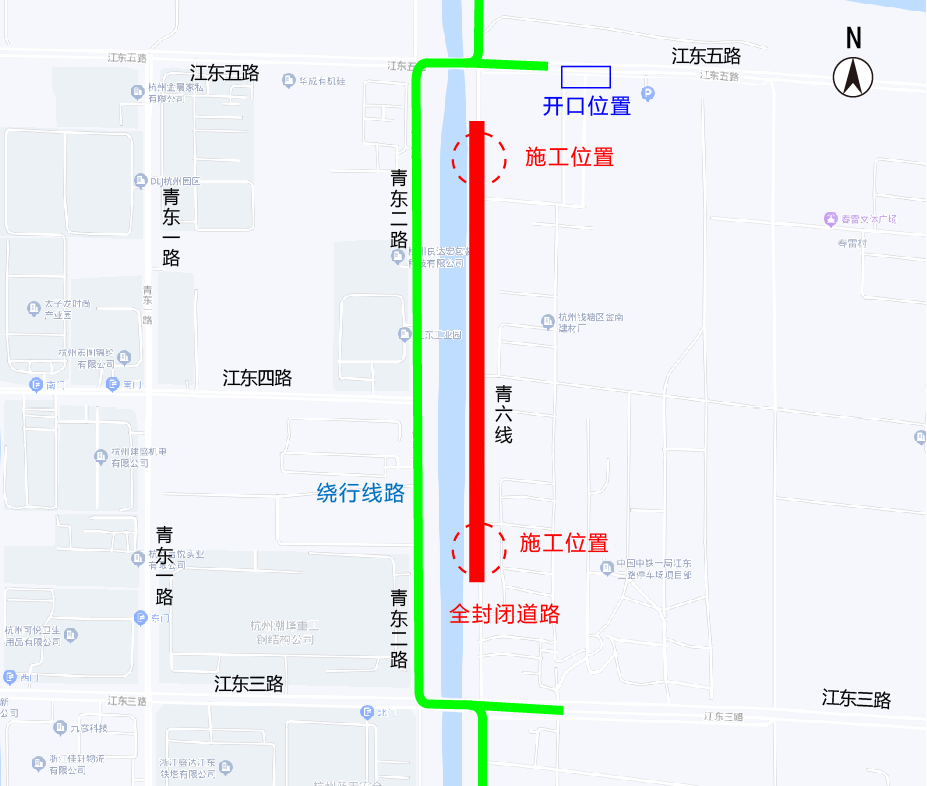 届时,请过往行人、车辆根据交通标志经由青东二路提前绕行。春雷村江东五路侧分带临时打开,受影响村民可借用该开口进出。