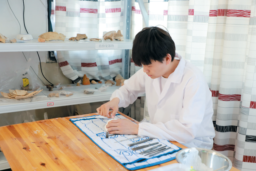 ▲考古人员在对出土陶制品进行修复