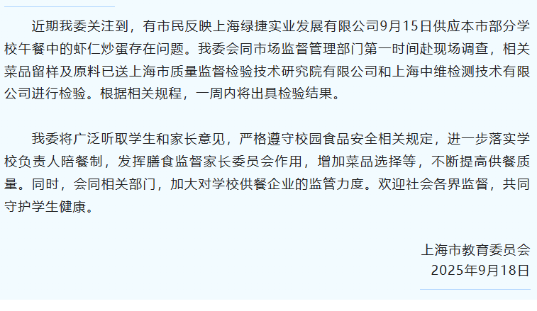 近期我委关注到,有市民反映上海绿捷实业发展有限公司9月15日供应本市部分学校午餐中的虾仁炒蛋存在问题。我委会同市场监督管理部门第一时间赴现场调查,相关菜品留样及原料已送上海市质量监督检验技术研究院有限公司和上海中维检测技术有限公司进行检验。根据相关规程,一周内将出具检验结果。