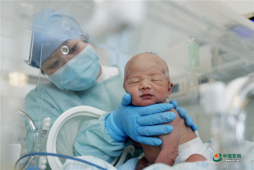 中部战区总医院收治的一名新冠肺炎确诊孕妇剖腹产下一名健康男婴。图为2月10日,医护人员精心照料新生婴儿。王皓宇 摄