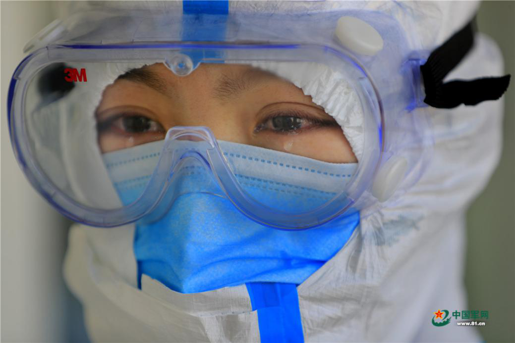 1月27日,中部战区总医院支援武汉肺科医院医疗队护士,因为长时间佩戴因消毒而刺眼的护目镜,流下了眼泪。王皓宇 摄