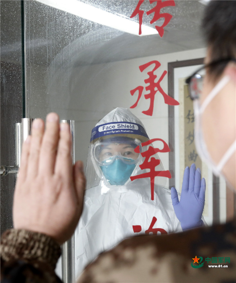 中部战区总医院同在一线的夫妻,疫情期间很少能见面。图为2月5日,黎华茂看望妻子吴娟娟,夫妇二人隔窗对视。王皓宇 摄