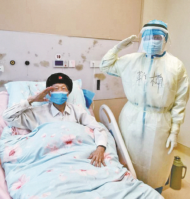 2月26日,在武汉泰康同济医院病房,抗美援朝老兵肖道清与军医靳楠一起面对镜头敬军礼。刘畅摄