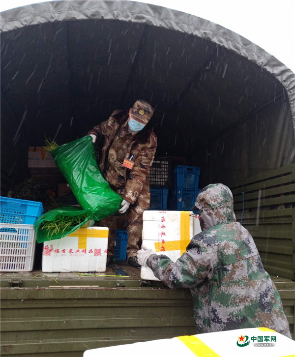 2月15日,武汉气温骤降,风雪交加。驻鄂部队运力支援队一如既往的给80个点位送去必备的物资。装卸货物时,仓库大多是露天的,即使戴着手套,官兵们的手很快也被冻得通红。即使这样,他们依旧按计划送出了270余吨的物资。图为运力支援队队员在风雪中搬运物资。陈兴旺 摄