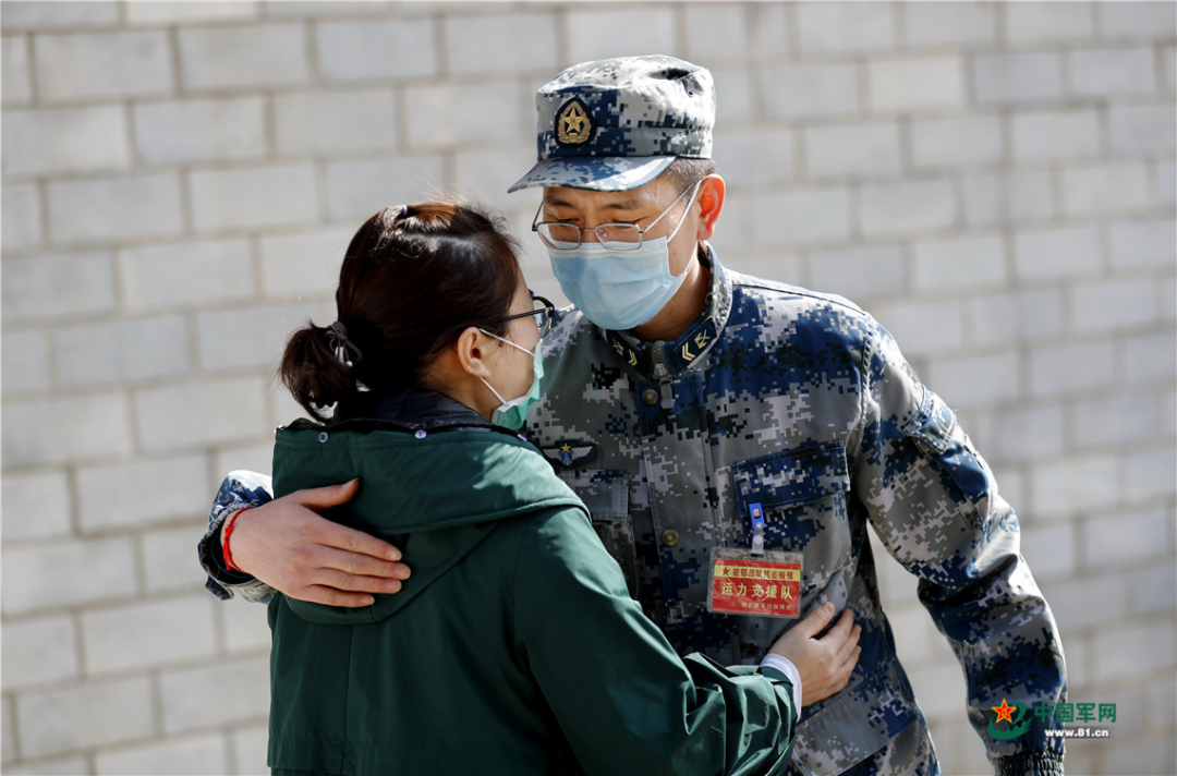 四级军士长王春尚是驻鄂部队抗击疫情运力支援队的一名驾驶员,他的妻子朱新苗是中部战区总医院感染科的一名护士,同在一线战斗。图为2月9日,他们在任务途中偶遇,仅有短短的9分52秒相聚。王皓宇摄