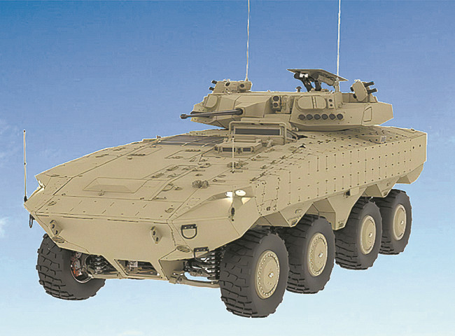 装有轻量版“铁拳”主动防护系统的“埃坦”轮式装甲车。资料图片