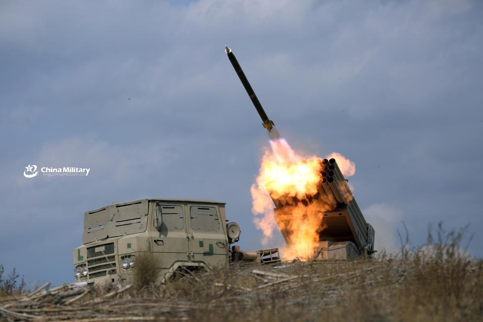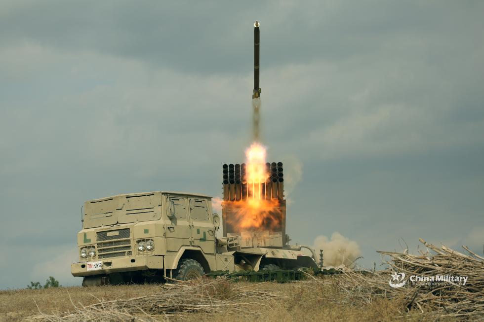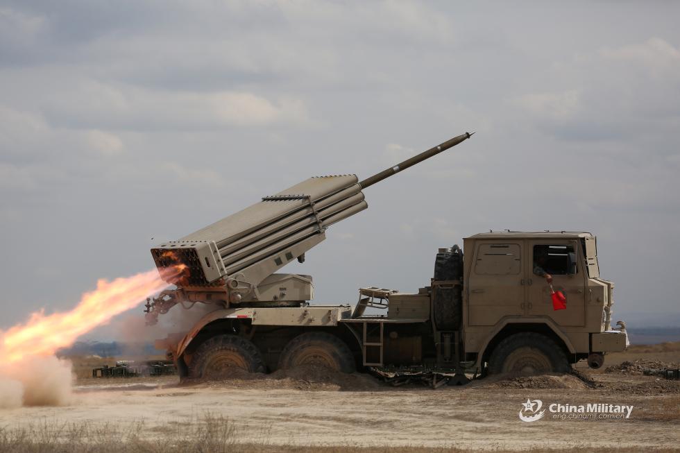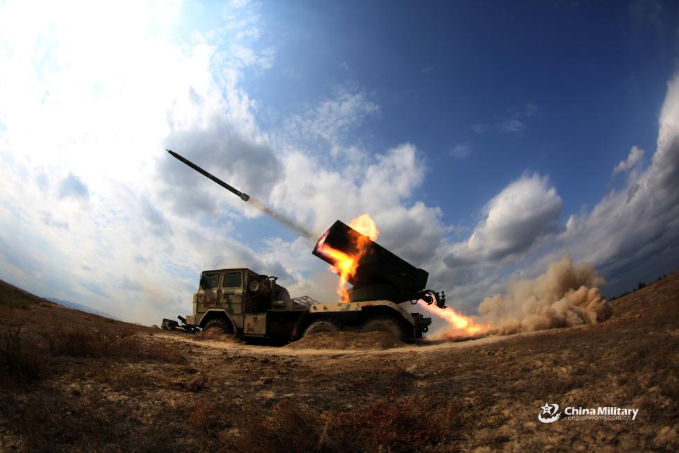 在中国西北戈壁沙漠最近一次实弹演习中,解放军新疆炮兵团自行122毫米多管火箭炮向模拟目标射击。