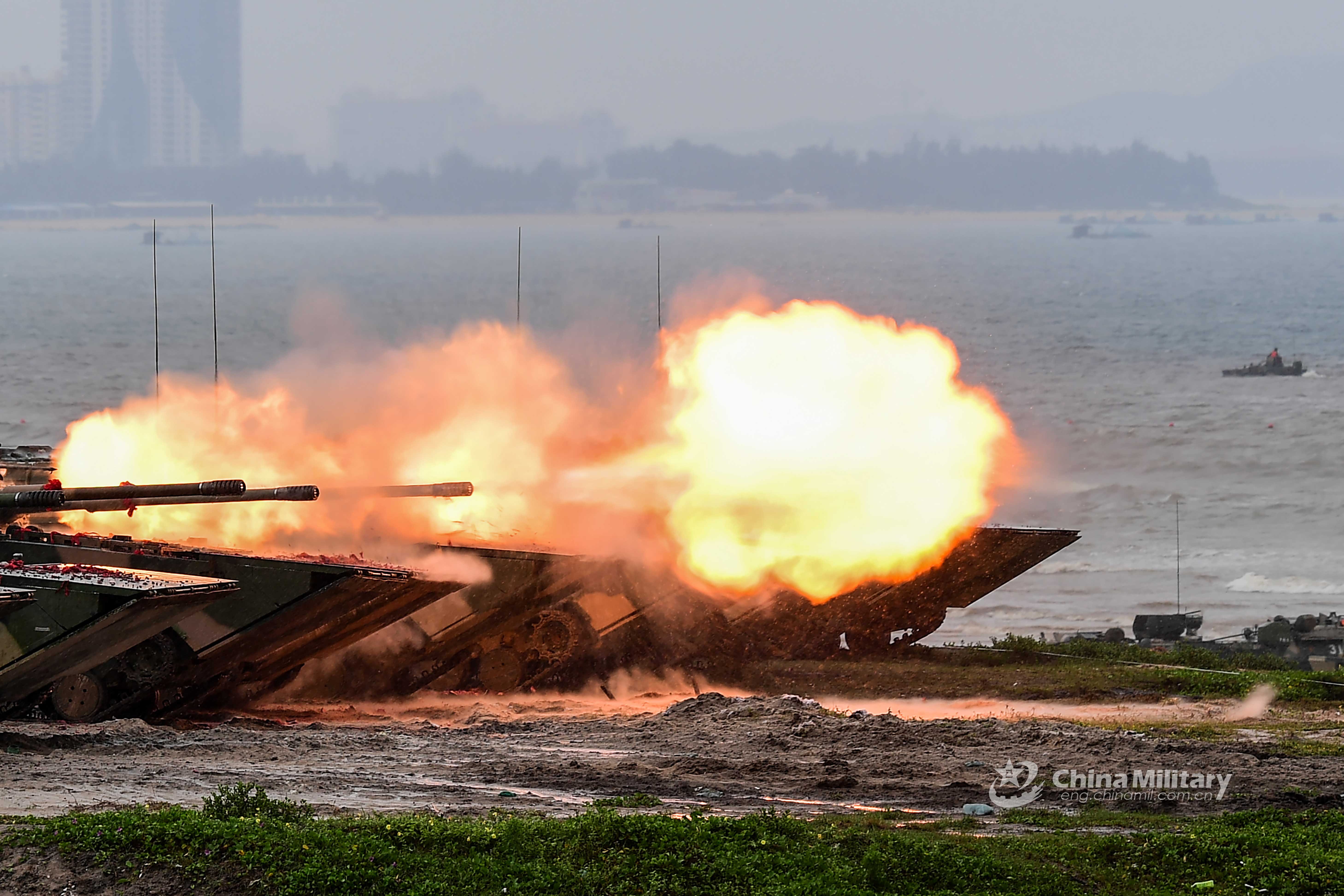 解放军合成旅练登陆作战 两栖突击炮摆一排开火