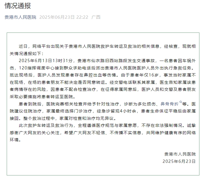 近日,网络平台出现关于贵港市人民医院救护车转运及救治的相关信息,经核查,现就相关情况通报如下: