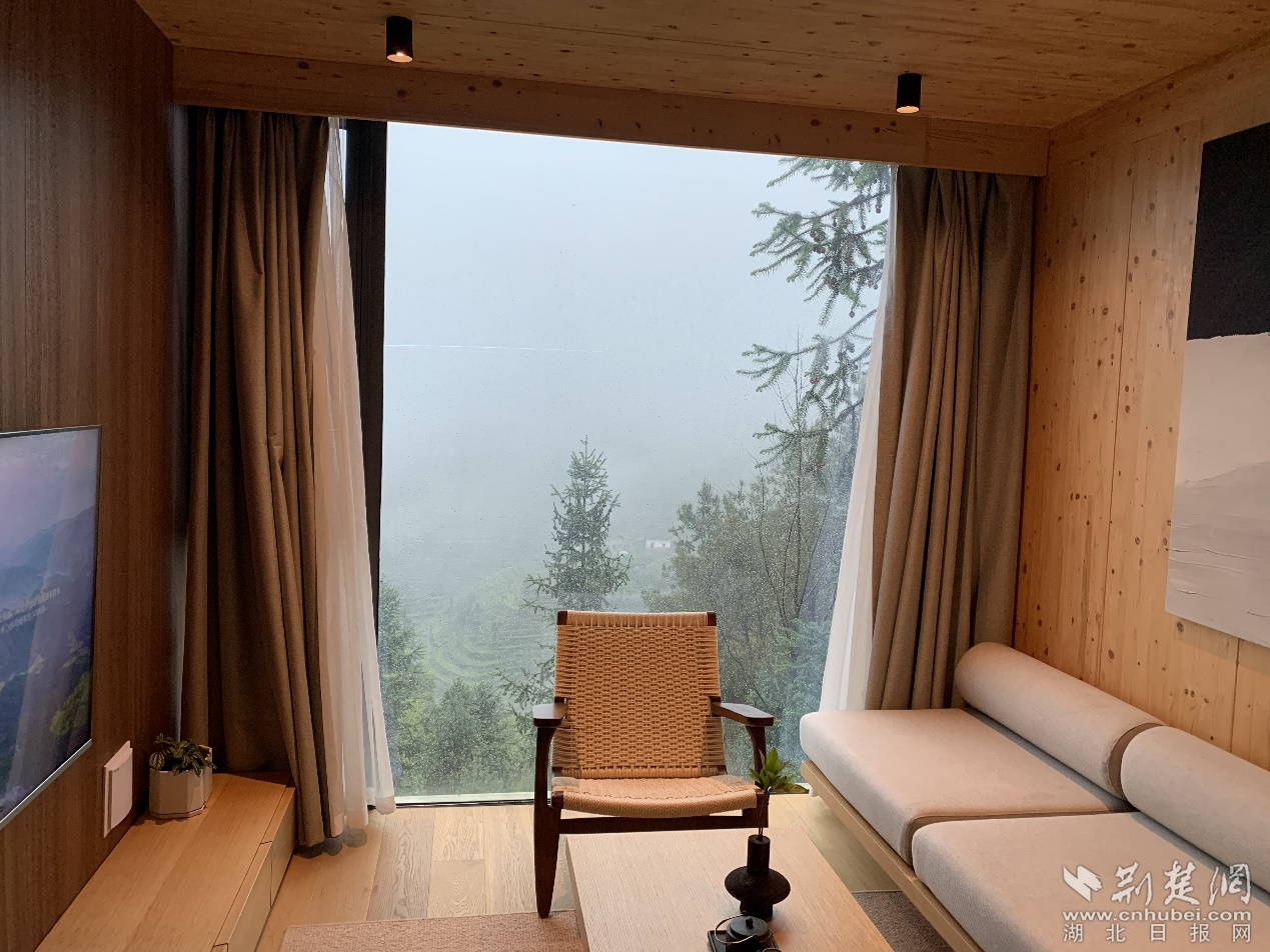 三峡茶旅小镇项目副总经理向清华介绍。目前,千山云舍18栋木屋度假酒店率先竣工,星空泳池、茶餐厅等配套设施正式投入运营。
