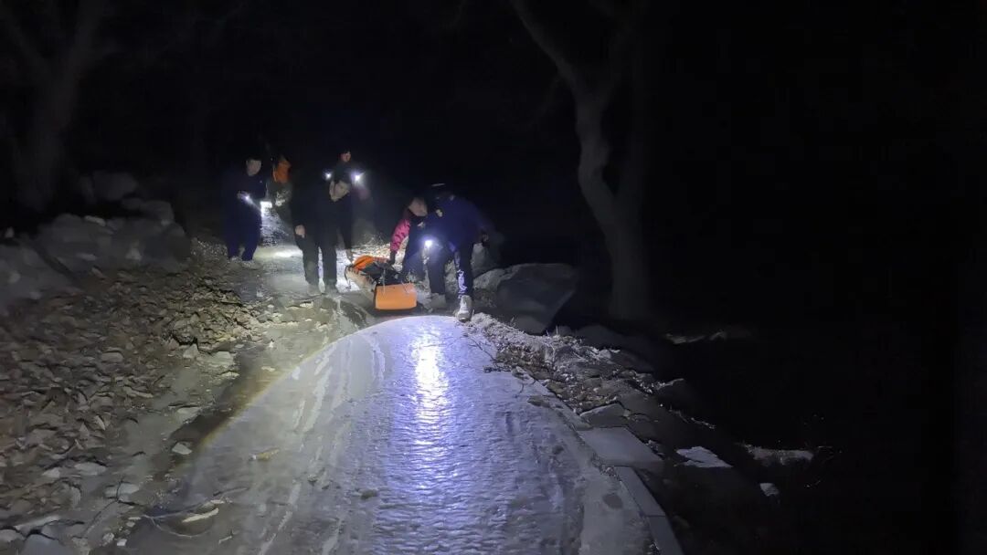 无法精准定位、老人无法回应呼喊、夜间山区气温极低、路面冰雪覆盖湿滑难行,多重难题叠加,让搜救工作步履维艰。想到老人已在山中滞留近10个小时,随时可能出现失温、摔伤等危险,现场指挥员王璐立刻和队员一起携带担架、急救包、照明设备等器材,沿家属指示的路线上山搜救。