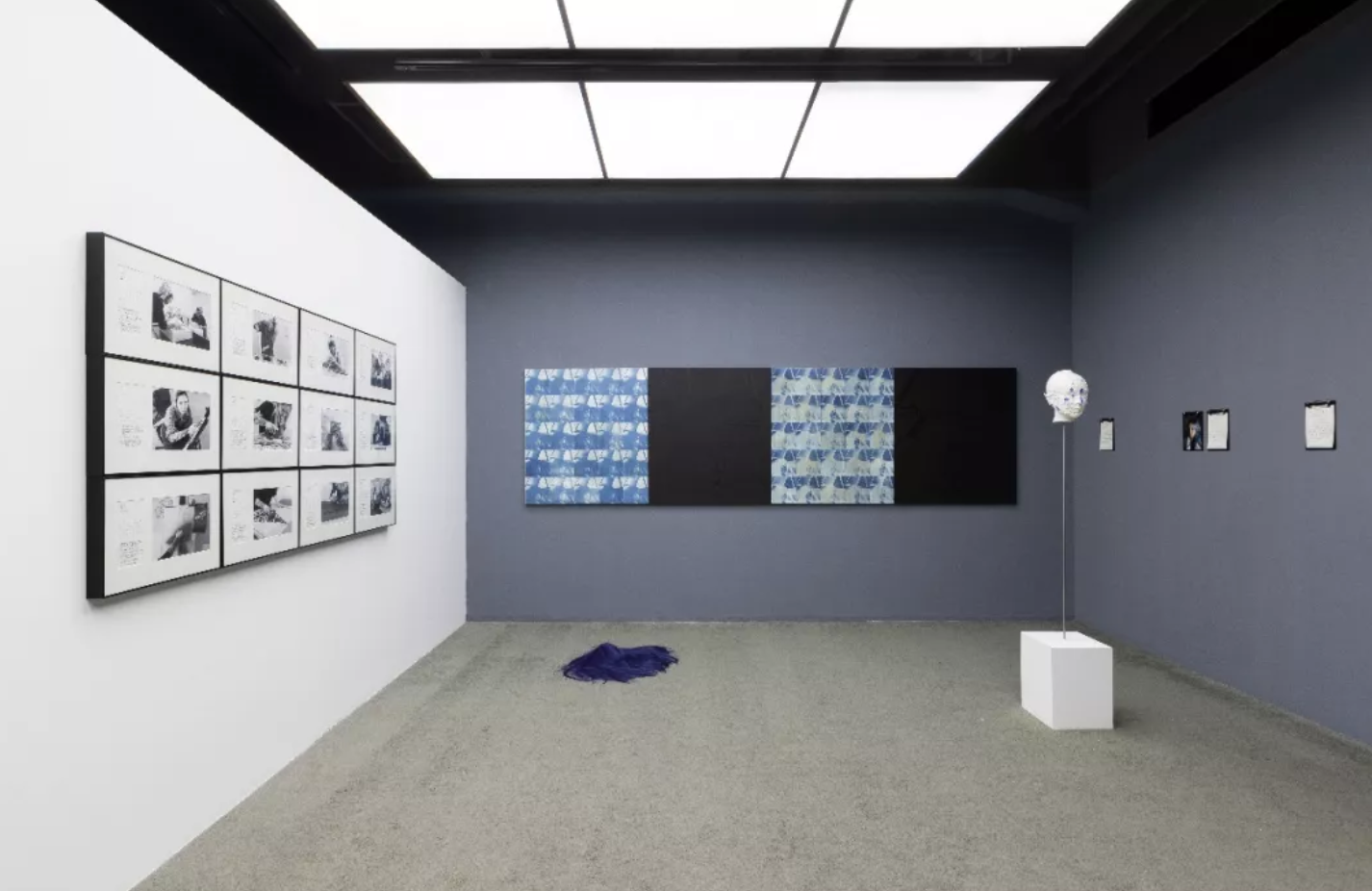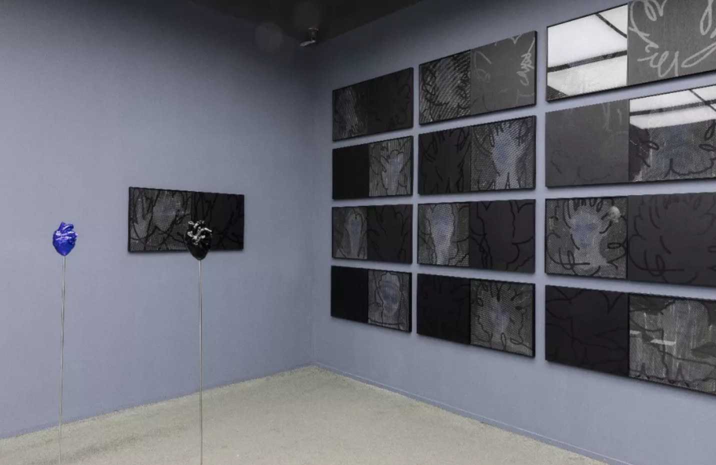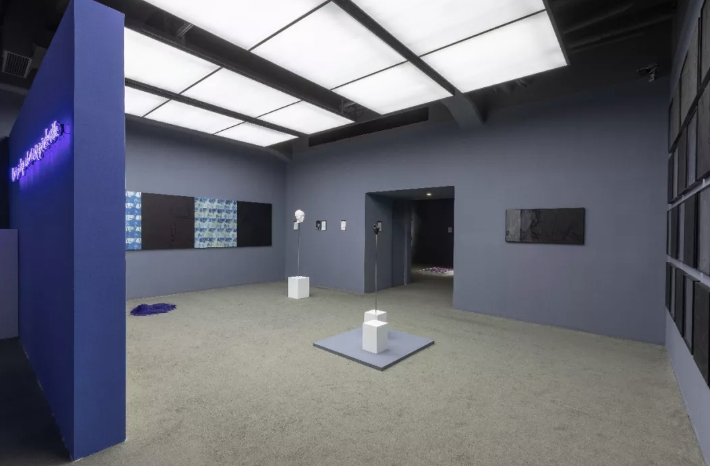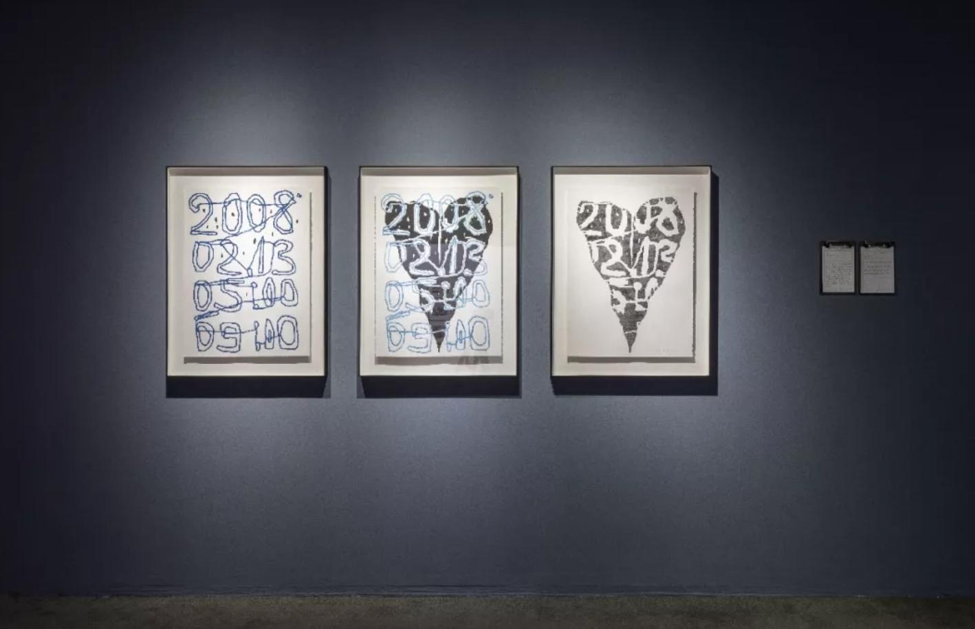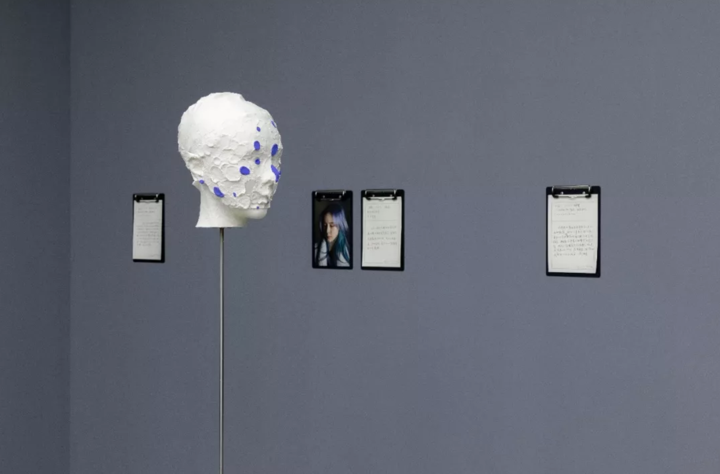 展厅里的日历陈述并记录了2019年王将与沉珂所开展的“艺术课”全过程,作为整体项目的叙事框架。素颜照与脆弱的纸质包裹的脸、蓝色的心脏、火星文、木刻版画,陈建州坐像,展览串联起不同形式与媒介的作品,它们关于时间、容颜、声名、病症、陪伴、爱情、死亡…