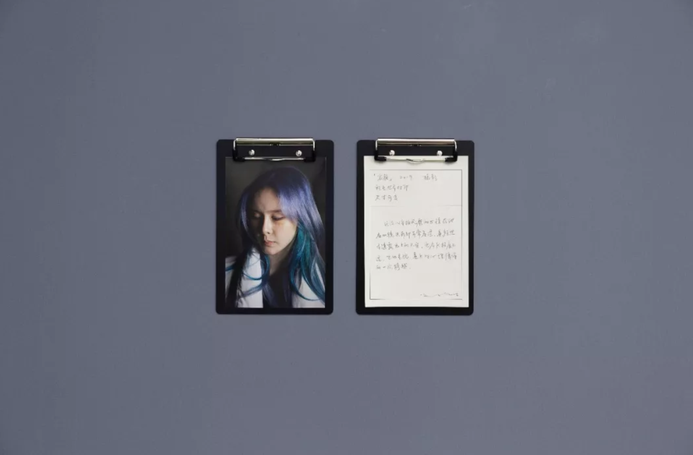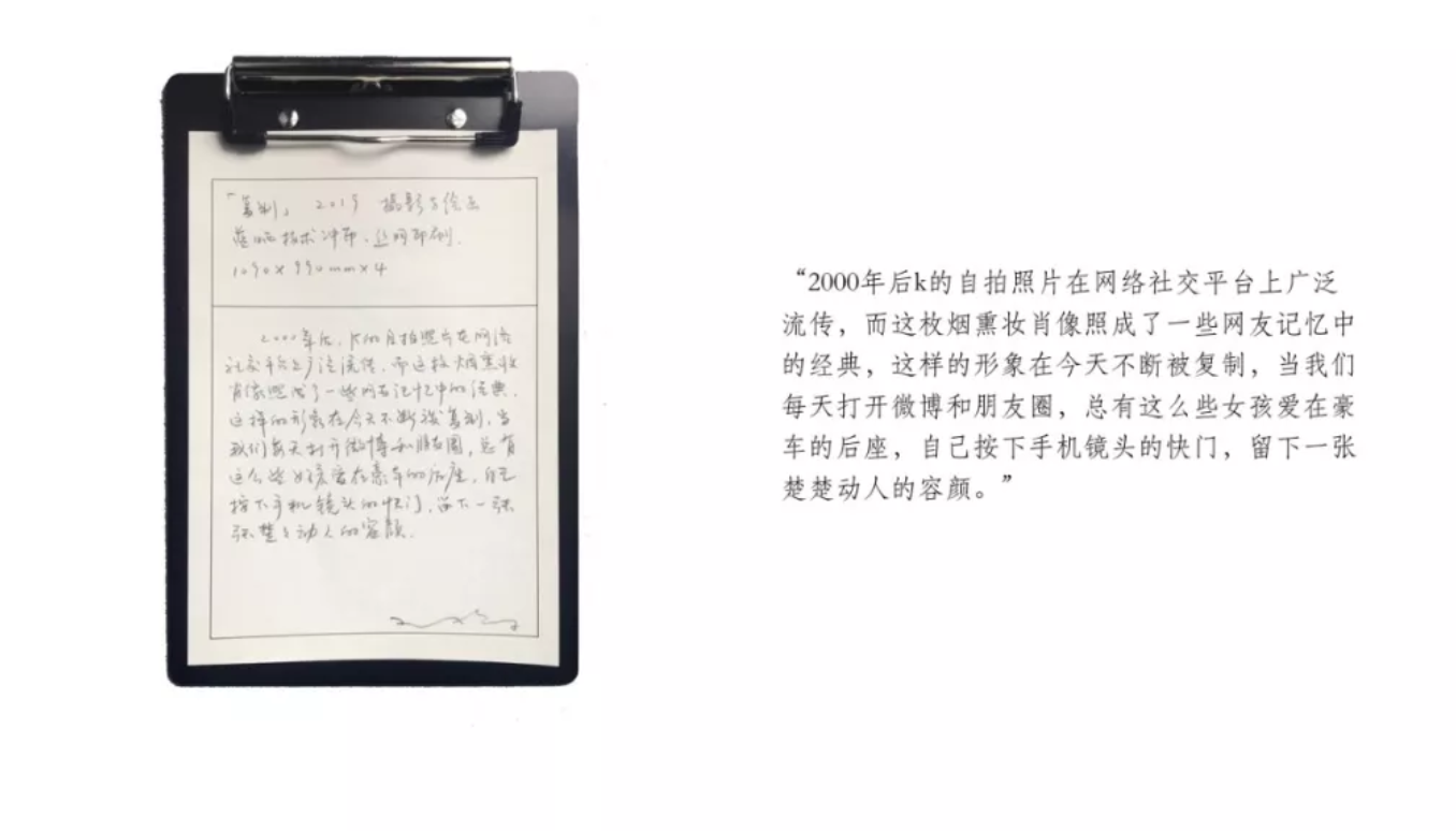 “2000年后,k的自拍照片在网络社交平台上广泛流传,这枚烟熏妆肖像照成了一些网友记忆中的经典,这样的形象在今天不断被复制,当我们每天打开微博和朋友圈,总有这么些女孩爱在豪车的后座,自己按下手机镜头的快门,留下一张楚楚动人的容颜。”一段段由王将以第一人称亲手书写的叙述,在展览现场以单夹形式作为展览作品的一部分。