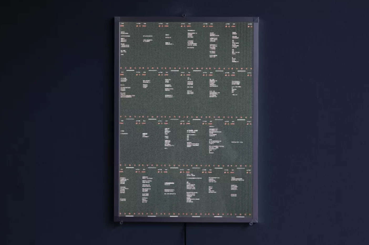 。日历这件作品,统领了展览的全局,这是我和沉珂合作过程的全部记录,对于她来说可能只是2019年的一段工作或故事,对于我,一个策划人,整个展览都是一件非常重要的作品,一件行动的创作和观念表达。艺术课里,作为一名老师的预设和构想、指引和协调都成为了这个展览的前提”。