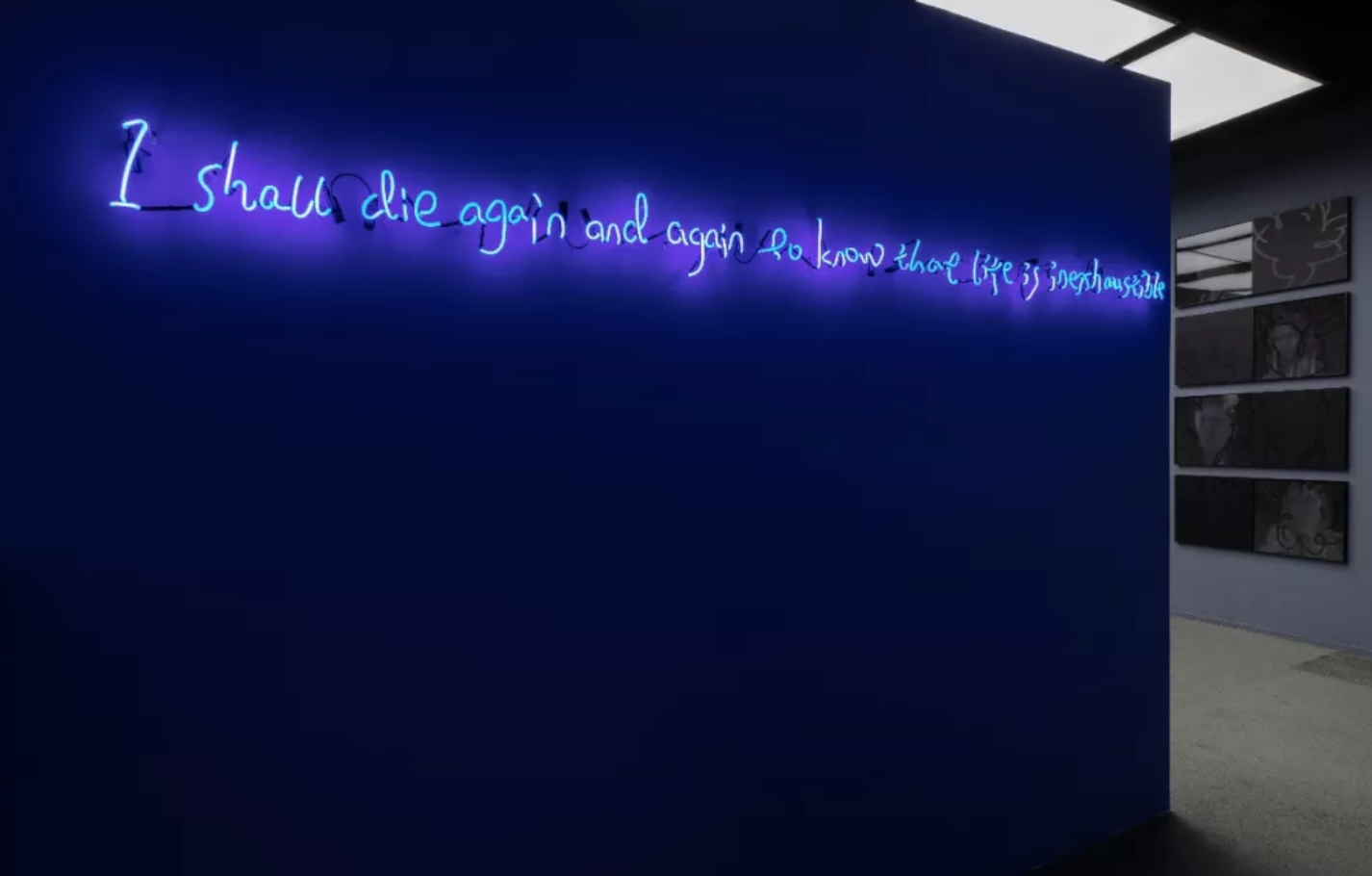 这句话出自泰戈尔的《飞鸟集》,也因为沉珂引用,成为了流传最广的“沉珂名言”。展览的开始,这撮发丝和这句话被创作成了一组发散蓝光的霓虹灯作品,暧昧灯光,冗杂书写,与展厅内的另一件作品《夜华》进行对话。