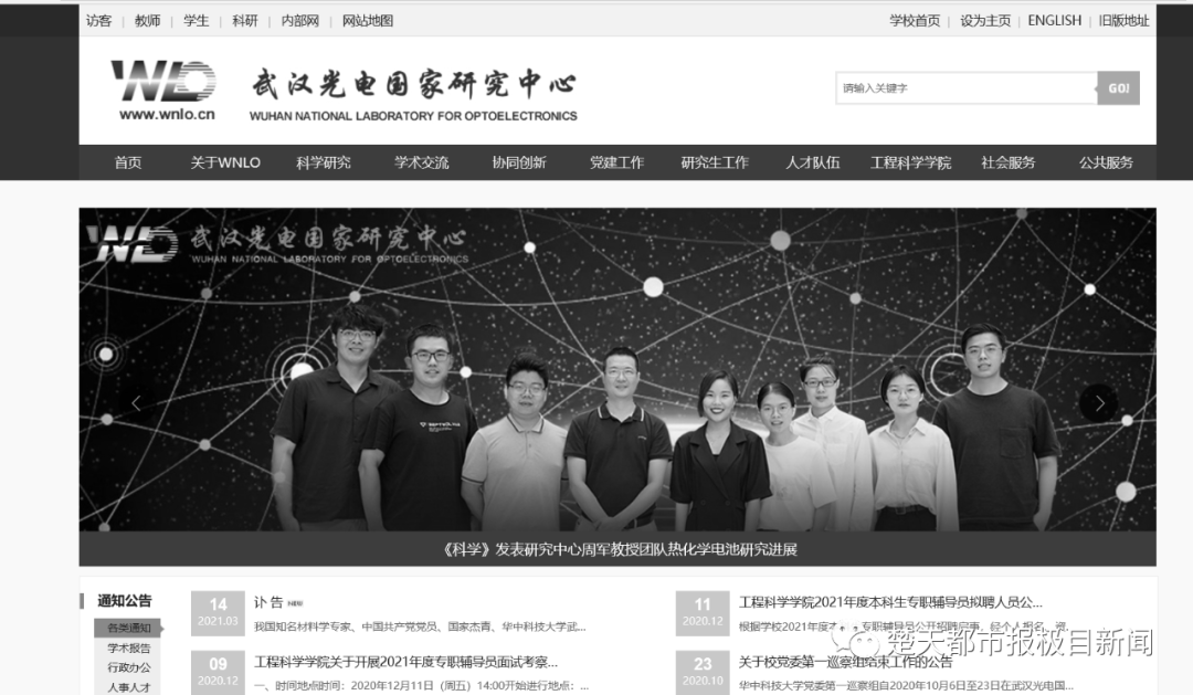 今日,极目新闻记者看到,该校武汉光电国家研究中心的官方网站界面已换为黑白。