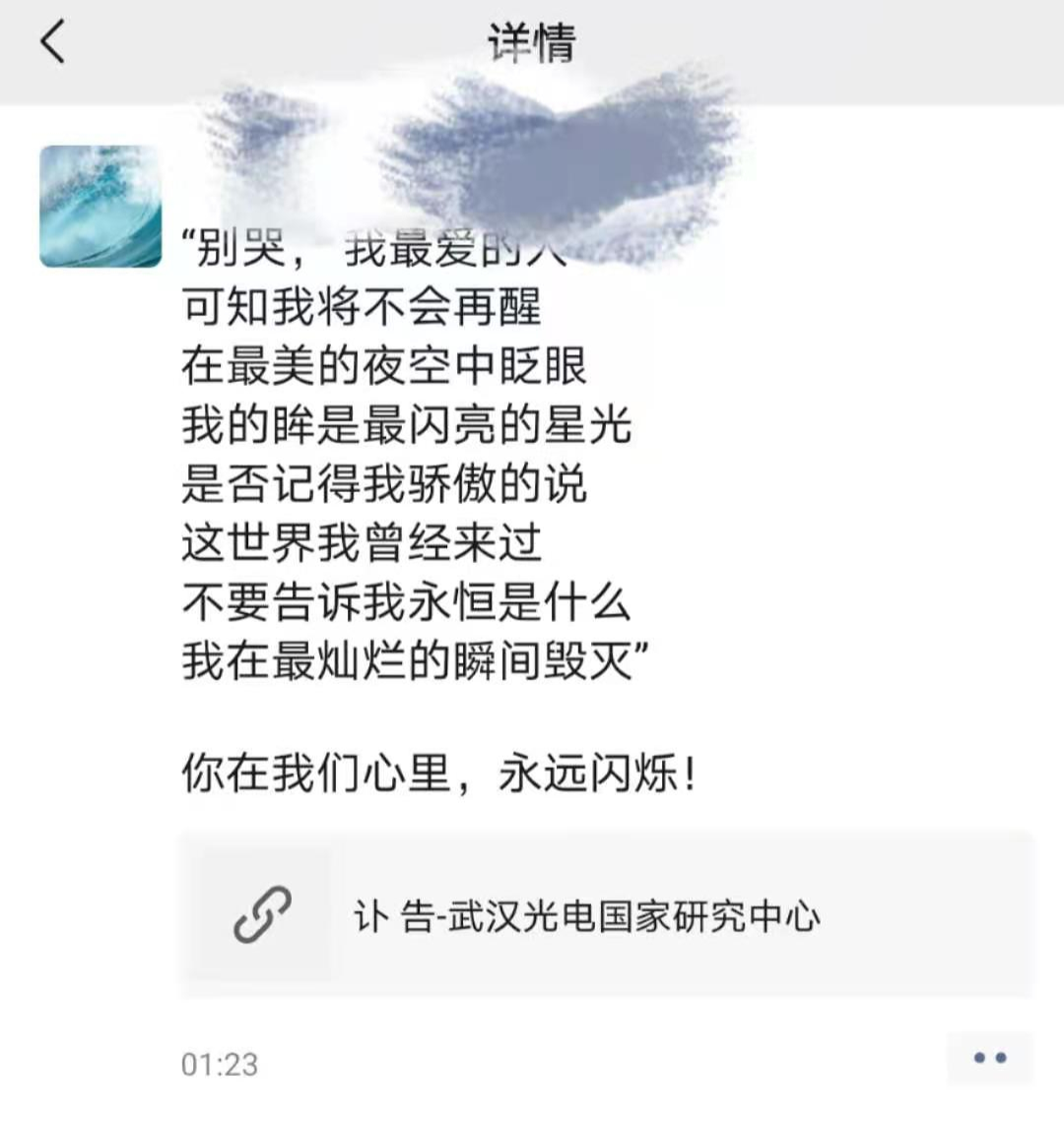 在该校最近的一次学术交流会上,他还和周军分别做了报告,“他做的武汉光电国家研究中心的报告,汇报做得很好。我们平常也有很多学术交流,他们中心的学术活动会请我过去,我们也邀请他来做交流。”李亮回忆道。除了工作,周军和李亮生活上互动也很多,“我身体不是很好,他就鼓励我多走路,跑步,他看到我朋友圈微信运动的步数,会给我点赞,还拉我进跑步群。”李亮说道。“周军是一个特别优秀,特别好的人。他很优秀也很谦和,总是笑眯眯的。他是在最灿烂的时候离开了,我们会永远记得他。”李亮说道。